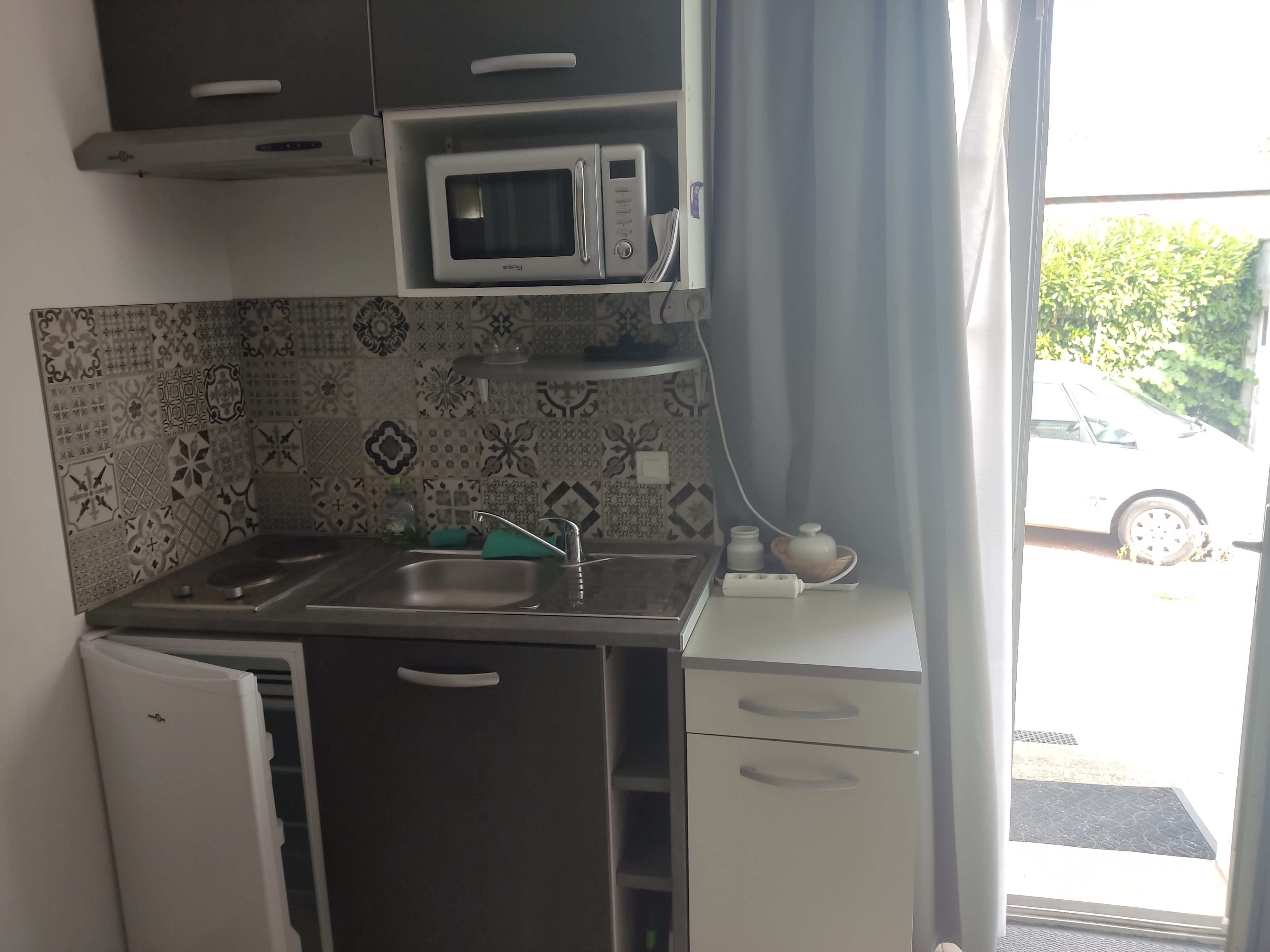 With an area of 13 m², it features a 140 x 190 cm bed, a fully equipped kitchenette (fridge, microwave, and hotplates), a Dolce Gusto coffee machine and a filter coffee maker with a dining area, a television, a workspace, and a bathroom.